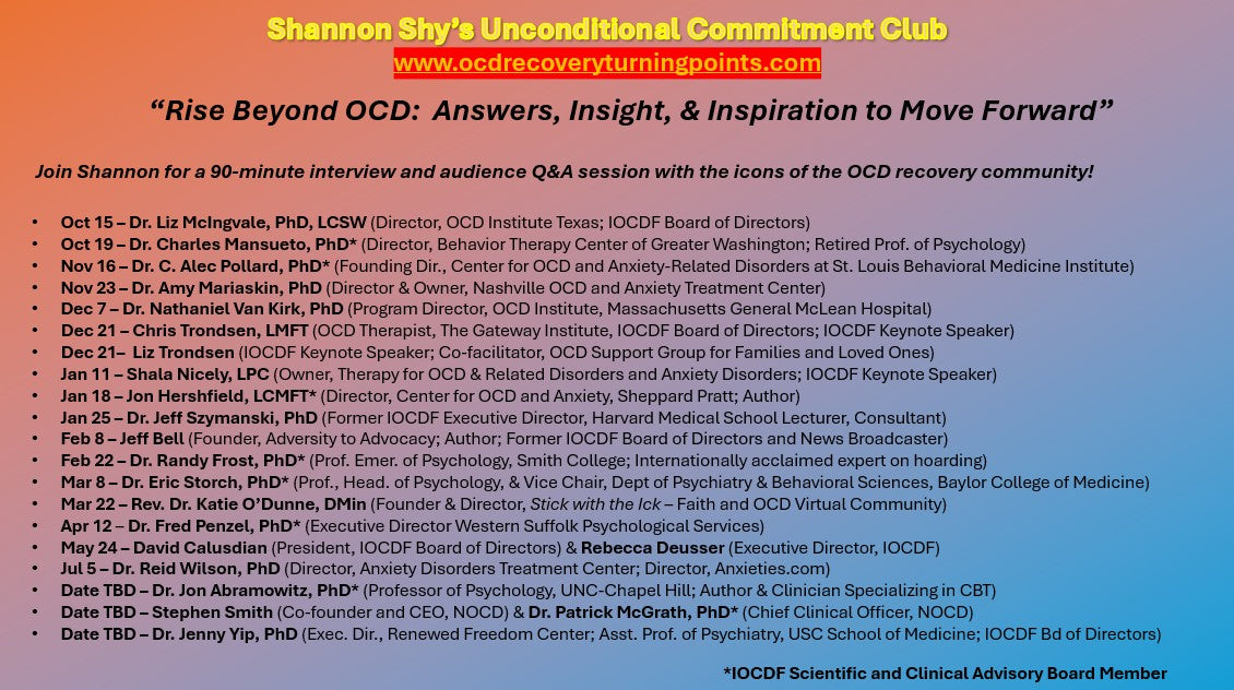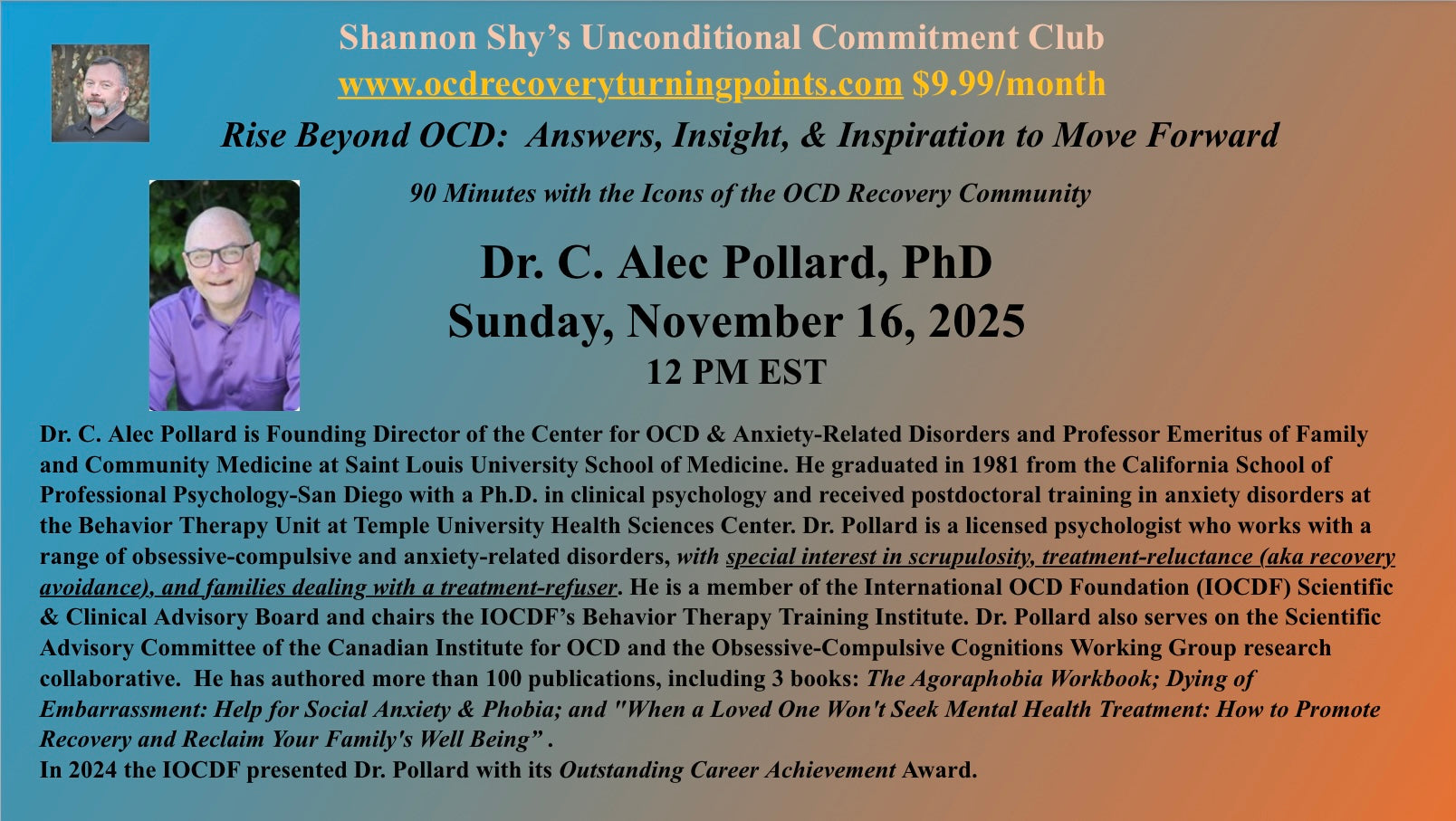Shannon Shy is a retired Lieutenant Colonel from the United States Marine Corps Reserve and a Certified Peer Recovery Specialist, shares his journey of overcoming severe OCD diagnosed during active duty. A former President of the International OCD Foundation and a Keynote Speaker at the 2010 annual IOCDF conference, Shannon provides many recovery resources for people suffering from OCD. The author of three books on OCD recovery and producer of an online OCD recovery course, he operates a members-based portal that contains a wealth of resources for those suffering from OCD, and provides virtual peer support worldwide, drawing from personal experiences and professional credentials. Shannon's effective peer support work offers hope, insights, and motivation for OCD sufferers to transform their perspective and lead fulfilling lives.