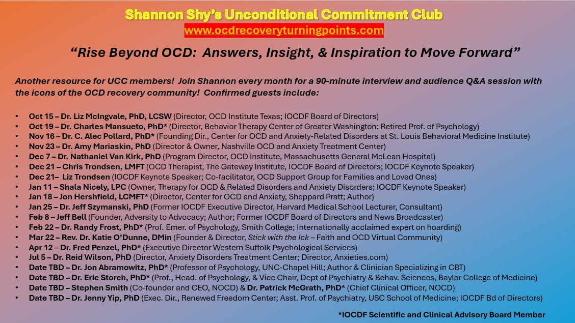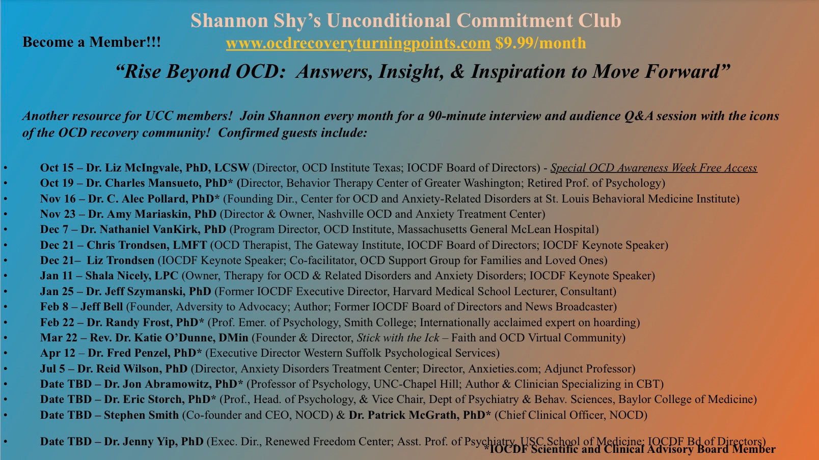 Shannon developed a course that includes presentations from experts and peer mentors across the OCD community. Through his course, the presenters will help you develop strategies to manage your OCD symptoms.