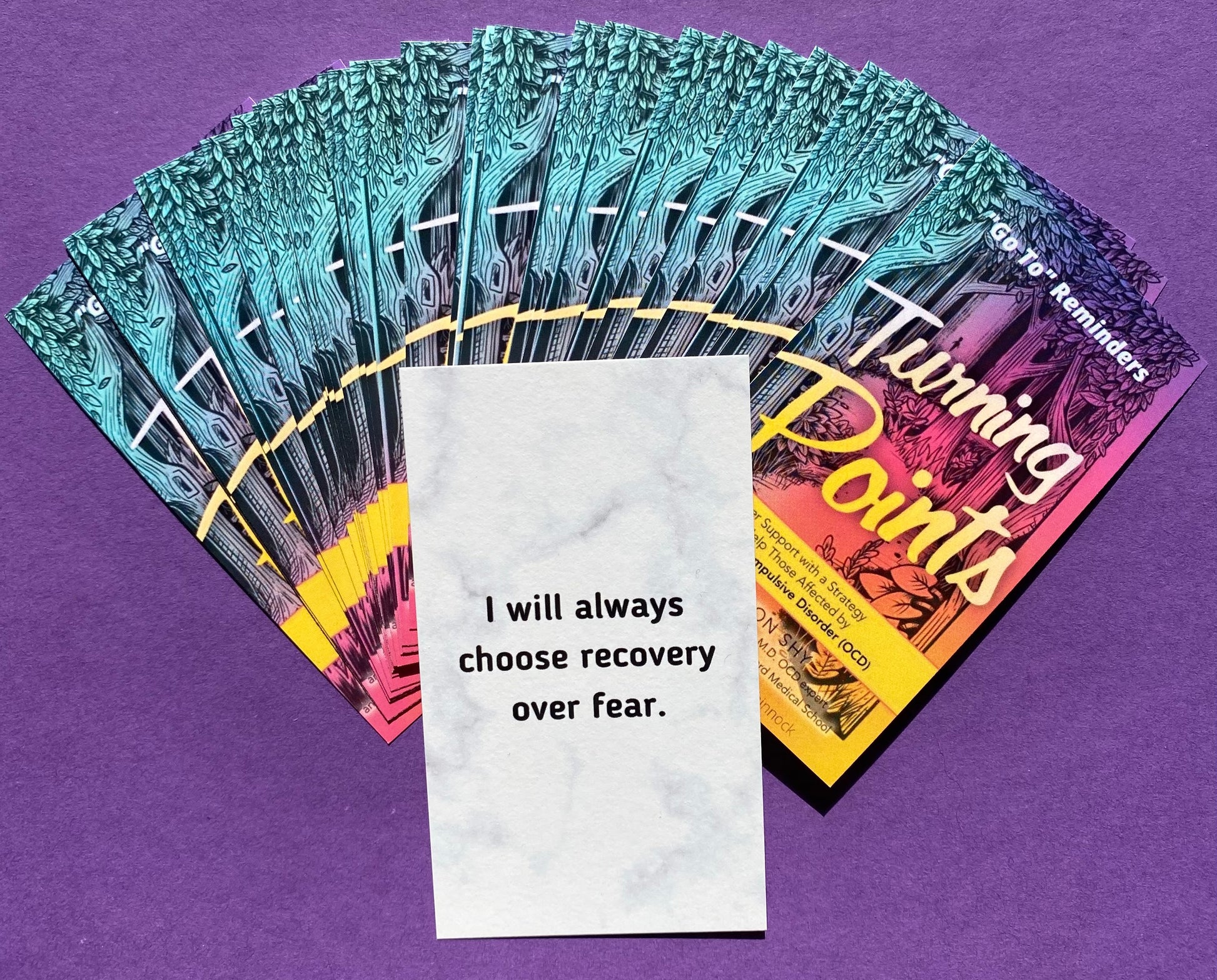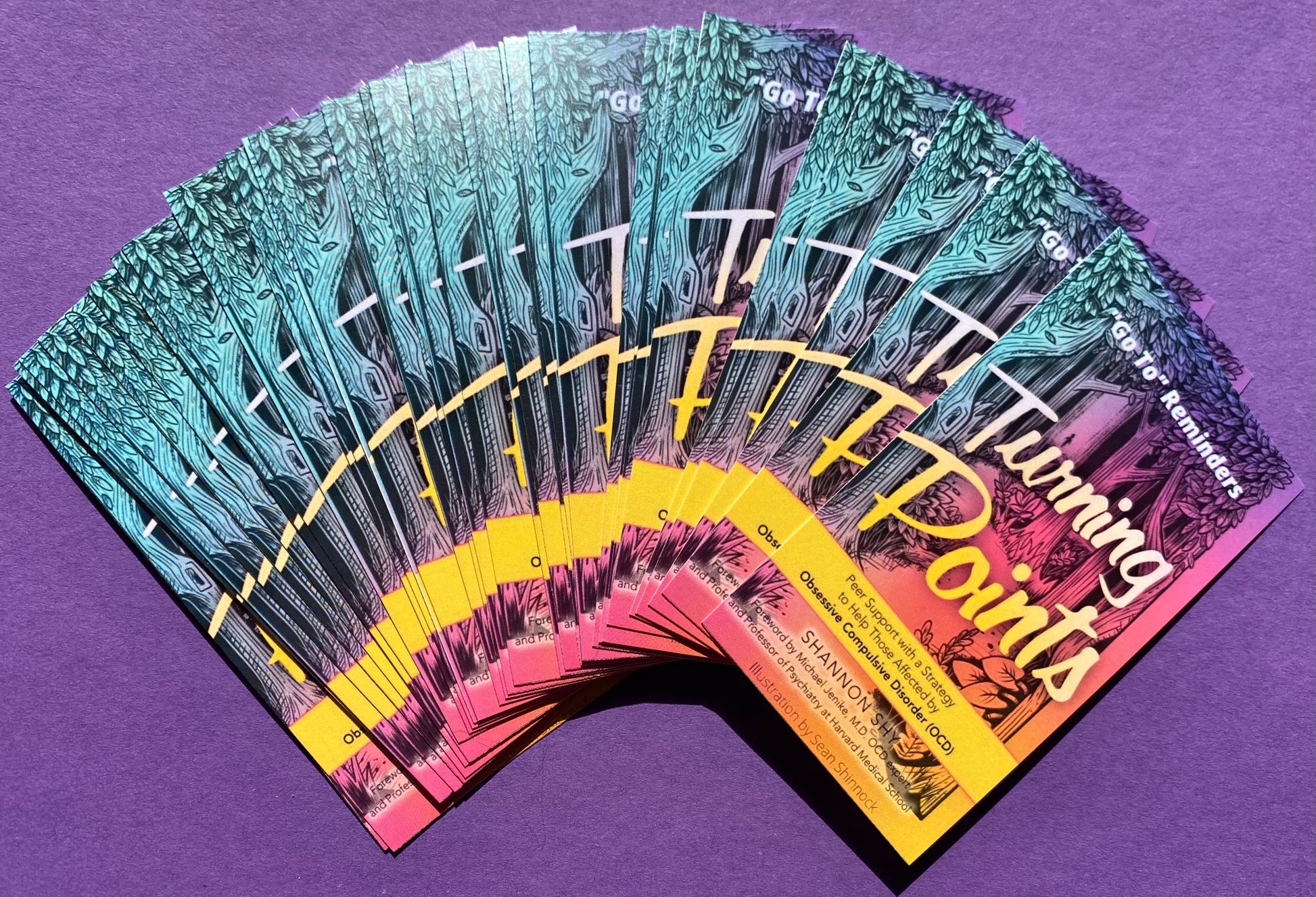 This deck of 32 business size cards is based on Shannon Shy's Quick Reminders for Success in overcoming OCD! Bring Shannon along with you each day as you choose one of his 32 motivational sayings printed on the back of each card. These motivation sayings are designed to help OCD sufferers on a daily basis, or as needed. The face of each card is based on the cover of Shannon's new book "Turning Points: Peer Support with a Strategy to Help Those Affected by Obsessive Compulsive Disorder (OCD)". A bonus card contains Shannon’s strategy for overcoming OCD. A great gift to give someone suffering from the disorder. *Free bookmark with every order*.